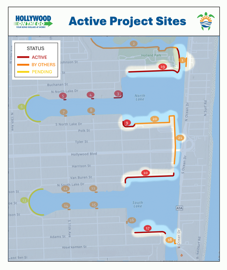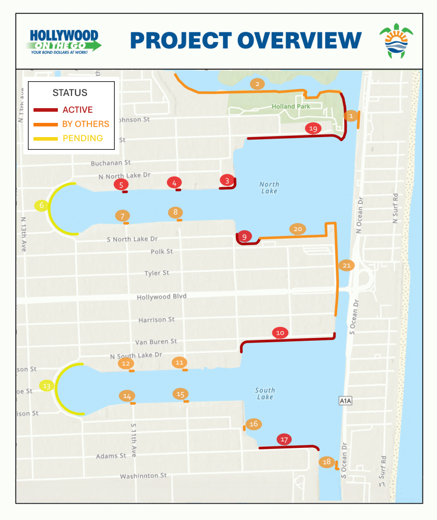 Construction is underway on the City of Hollywood’s Tidal Flooding Mitigation and Shoreline Protection Project at multiple locations around North Lake and South Lake. This project is designed to reduce tidal flooding, strengthen shoreline infrastructure, and improve long-term resilience within the Hollywood Lakes community.